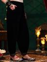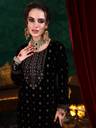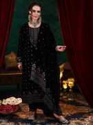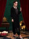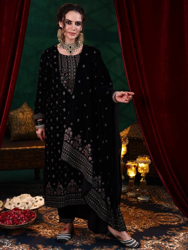 Black zari neck embellished velvet kurta with pockets & solid trouser and floral embroidered dupatta