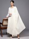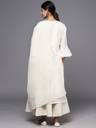 Our 3-piece cotton off-white suit set, highlighted with floral embroidery, features a straight shape and regular style kurta with a round neck, three-quarter bell sleeves, and a calf length with a straight hem. The palazzos are embroidered with a partially elasticated waistband and slip-on closure. Adorned with a matching dupatta, this style is ideal for light festivities.