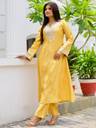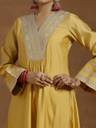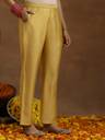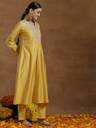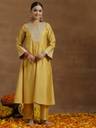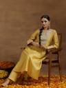 Our 2-piece yellow yoke-design kurta set, crafted in sumptuous silk blend fabric, features an A-line pleated kurta with a V-neckline, flared sleeves, and a statement yoke. Complemented with trousers with a partially elasticated waistband and roomy pockets. Highlighted with intricate thread work and sequins, this charming style is perfect for festive celebrations.