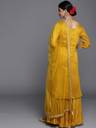 Our 3-piece mustard yellow solid-tone silk blend suit set features a straight-fit kurta with a round neckline, three-quarter sleeves, and a scalloped hemline. Complemented with sharara pants with a fully elasticated waistband and a sheer net dupatta. Adorned with Gota Patti detailing, intricate embroidery, sequins detailing, and delicate tassels, this charming style is perfect for festive celebrations.