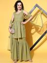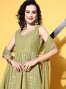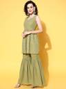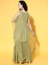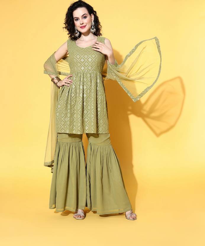 Our 3-piece olive green georgette suit set features a sleeveless A-line kurti with a round neckline and pleated detailing. Complemented with sharara pants with a partially elasticated waistband and a net dupatta. Adorned with sequinned detailing and thread work, this style is perfect for light festivities.