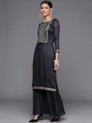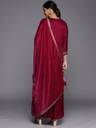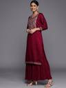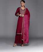 Our 3-piece fuchsia embroidered silk blend suit set features a straight-fit kurta with a V-neckline, three-quarter sleeves, and a statement yoke. Complemented with Sharara pants with a fully elasticated waistband and roomy pockets, and a dupatta. Adorned with thread work, sequins accents, and tassel detailing, this style is perfect for festive celebrations.