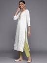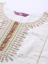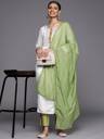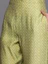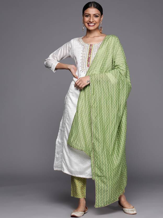 Our 3-piece Chanderi silk suit set features a straight shape cream kurta with a round neck, ethnic motifs yoke, sequinned detailing and regular three-quarter sleeves. Complemented with a green chevron print palazzos, with an elasticated waistband, 2 roomy pockets, slip-on closure, and a matching printed dupatta, this style is perfect for elevated everyday wear.