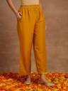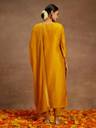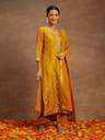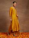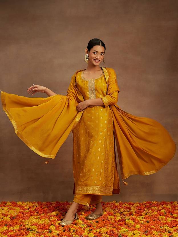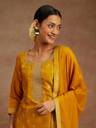 Our 3-piece mustard yellow suit set features a straight-fit kurta with a round neckline and sequin accents.