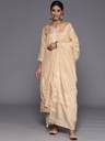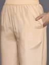 Our 3-piece beige silk blend woven design suit set features a straight-fit kurta with a classic V-neckline, three-quarter sleeves, and a statement yoke. Complemented with solid tone straight pants with an elasticated waistband and roomy pockets, and a striped dupatta with tassels. Adorned with delicate fabric-trim accents, this elegant style is ideal for casual outings.