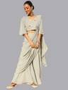 Our grey ready to wear palazzo saree, crafted in flowy georgette fabric, features a partially elasticated waistband and a flared hemline. Complemented with an overall sequinned, round neckline, sleeveless blouse with flared three-quarter sleeves, and a stylish drape. Adorned with sequins and embroidery, this charming style is perfect for light festivities.