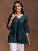 Our pink embroidered A-line silk blend kurti features a V-neckline and three-quarter flared sleeves. Elevated with paisley embroidered motifs and pleated detailing, this style is perfect for casual outings.
