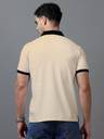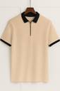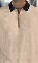 This classic polo shirt gets a modern update with its ribbed Beige knit fabric. It has a contrasting solid black collar and black trim on the cuffs. A sleek gold-tone zipper replaces traditional buttons, giving it a sophisticated and contemporary look.