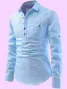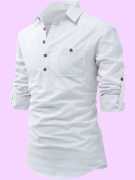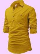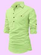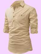 This short kurta with a collared design and a chest pocket. The shirt has a half-placket button closure that goes halfway down the chest, providing a casual yet sophisticated look. The buttons on the placket and chest pocket are visible, and the sleeves are rolled up, secured with a button tab, adding to the relaxed style. The fabric appears to be light and comfortable, suitable for warm weather or casual outings. This style combines traditional elements of a kurta with a modern, casual twist.