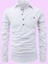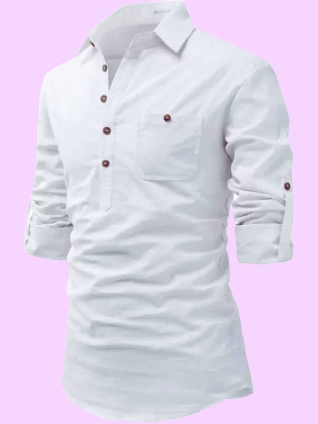 This short kurta with a collared design and a chest pocket. The shirt has a half-placket button closure that goes halfway down the chest, providing a casual yet sophisticated look. The buttons on the placket and chest pocket are visible, and the sleeves are rolled up, secured with a button tab, adding to the relaxed style. The fabric appears to be light and comfortable, suitable for warm weather or casual outings. This style combines traditional elements of a kurta with a modern, casual twist.