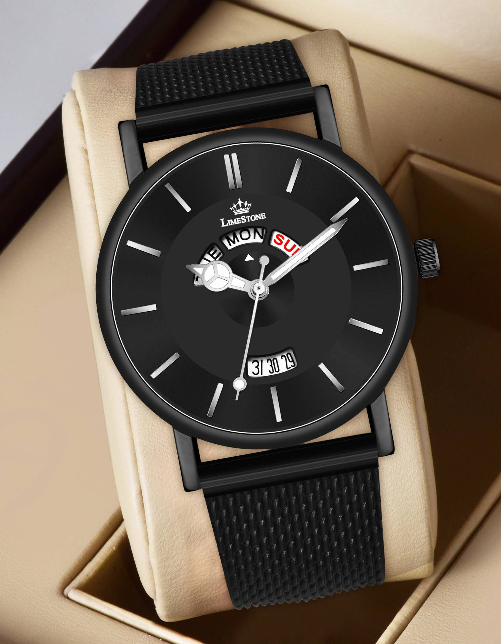Presenting the Limestone Day & Date Display Stealth Minimalist All Black Edition Quartz watchβa masterpiece of affordable luxury designed for the modern individual who values style, versatility, and uncompromising quality.