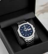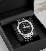 Practical features include a day-date display, with the day of the week visible at the 3 o'clock position and the date clearly indicated in a window at the 6 o'clock position. This combination of sophisticated design, durable materials, and useful complications makes it an ideal accessory for everyday wear or special occasions.