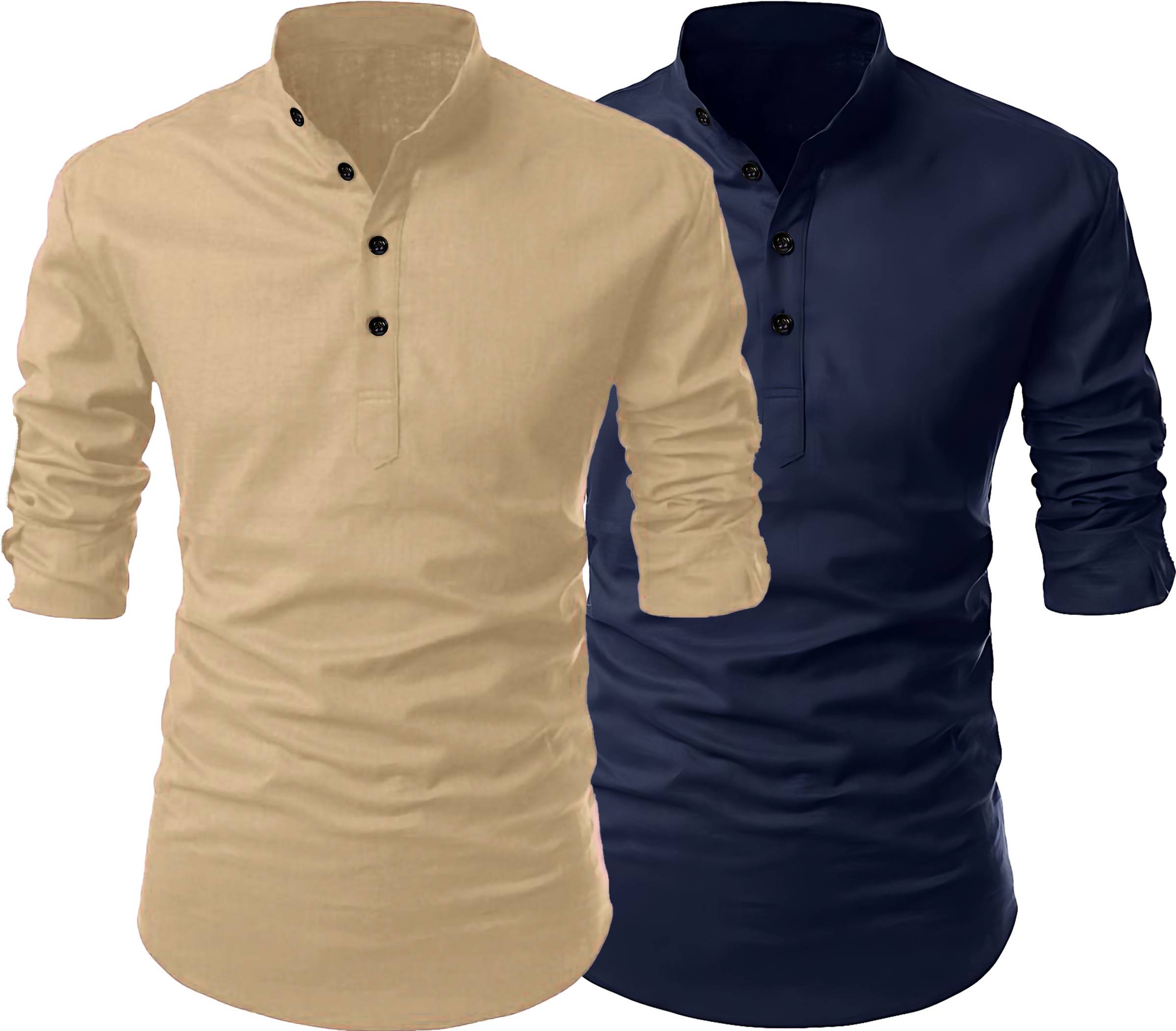 Pack of 2 Men Solid Cotton Blend Straight Kurta (Gold, Light Blue)