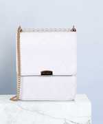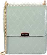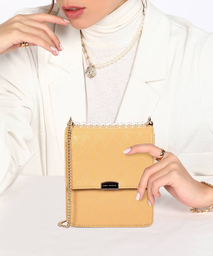 A Diamond Shape Sewed Pattern,White Pearl Detailing And Golden Trims Enhances Its Aura. The Bag Is Made From Faux Leather. This Ladies Bag Can Be Carried As A Clutch Bag As Well, Which Goes Perfectly With Your Evening Party Look And Can Carry Your Essentials Like Wallets, Small Purse, Phone Etc. Additionally,A Long Golden Metal Chain Makes It Very Versatile As It Can Be Carried As A Crossbody Sling Bag For Girls. Just A Mini Satchel Which Enhances Your Attire. This Latest Branded Lino Perros Women Bag Gives You A Utterly Chic Look.