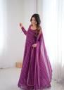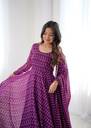 Elevate your elegance with this stunning Georgette Anarkali Gown, crafted to flow gracefully with every step. Designed in a rich plum-purple hue, the gown features a delicate all-over patterned print that adds a touch of modern charm to its traditional silhouette.