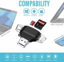4 in 1 OTG Card Reader Four Ports : Lightning + Type C + Micro USB + USB Card Reader - Like Iflash, Idisk. Memory Card Reader with OTG (Android phone must with OTG function) Backup your important Photos,Music,Videos, and Contact list. Supporting online software upgrades. Portable for business(convenient for file work). Secured file encryption for private file. Document viewer for all major file formats. Support SD and TF card Free App from App store for communication between your Devices. Securely store and share digital contents such as movies, pictures, and music from your phone. Read almost all your memory cards with speed and convenience. Combining four interfaces(Lightning + Standard USB + Micro USB+ Type C) into one flash drive with cross design to handle with ease. Portable Design Lightweight multi-function Cross Design SD & Micro SD Card Reader, One card reader to satisfy all your needs, easy carry to anywhere you like. Support Multi Card Support SD & Micro SD Card - Support Max 256GB SD / Micro SD / SDXC / SDHC / Micro SDXC / Micro SDHC / TF / UHS-I Camera Memory Cards. Fast Data Transfer Card Reader Function as OTG (On the Go Function) with Reading speed will be 30Mb/s & Writing Speed is 30Mb/s. Device For All Mobiles & Laptops Smart Cellphone ? All the android phones with OTG function i-fone ? i-fone 5 / 6 / 7 / 8 series Tablet ? i-Payd Pro / i-Payd Air / i-Payd Air 2 / iiPayd 4 / i-Payd mini PC ? With OSX/ Windows/ Linux operation system Media player ? i-Poad Touch 6 / i-Poad Tuch 5. Precaution Notice: Please do not disconnect card reader during file transfer. Please do not connect both side of card reader at the same time. Please do not use card reader as cable. If iOS device pops up a message said "this accessory is not optimized for this phone", just disconnect and reconnect again. Package Including: 1 x 4 in 1 OTG Card Reader.
