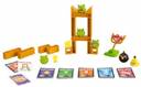 3 Angry Birds, 1 Angry bird Launcher, 4 Pigs, 1 Bonus point star, 1 bonus points egg, 14 building blocks, 16 points cards, 40 mission