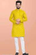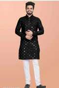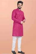This traditional Indian kurta pajama set includes a top (kurta) with and a bottom (Pajama). Loose fitting sleeves and slits along the sides allow for an easy fit and let air circulate freely through the garment. The pant included in this kurta pajama set has a relaxed fit through the seat and legs for absolute comfort. regular comfortable fitting makes it a great wear.