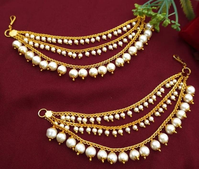Name: LITRIK Brass Copper Earrings Chain White pearl Studded Kan chain south indian Champaswaralu Matilu Earrings For Women wedding bridal Set kaan Hair Accessory Alloy Jhumki Earring Chain Clip on hair Earrings