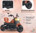 Little Funky Goldwing Kids ride on an electric bike can shift forward/ backward level by using the control button. you can control the variable speed of the bike by foot accelerator with safe speed. This kid’s electric bike has an inbuild music button, working headlight, USB Port, on and off switch, foot accelerator, simply press the Forward-Backward switch then press the accelerator to move with realistic engine sounds are fun and interactive for kids and It gives a realistic driving experience for your kids. The Baby bike comes with a three-wheel design to keep children's balance and free them from the danger of falling over. The tires with an anti-skid pattern can effectively increase the friction with the road surface, allowing kids to ride on various flat surfaces. It is Made of safe environmentally friendly plastic material. This ride-on bike is durable and harmless to the human body. Moreover, it comes with a rechargeable battery and charger adapter, allowing kids to enjoy 40mints of playtime. The charging time is about 8-12 hours each time. Bright LED lights on the headlight to brighten up the dark surroundings for safe driving. It’s cool and realistic look like a real bike can stimulate the interest of children, the product requires easy self-assembling. This electric ride-on bike is a perfect gift for kids who love vehicles and want to experience the thrill of riding in a safe, controlled environment. It combines fun, safety, and modern technology to create a memorable playtime experience.