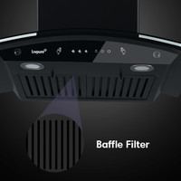 Owing to its attached baffle filter, the Livpure Elega-90 cm Autoclean Wall-mounted Chimney prevents clogging and unpleasant smells by trapping grease and oil, resulting in a clean, odour-free kitchen.