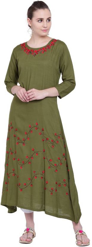 Women Printed, Embroidered Viscose Rayon A-line Kurta (Green)