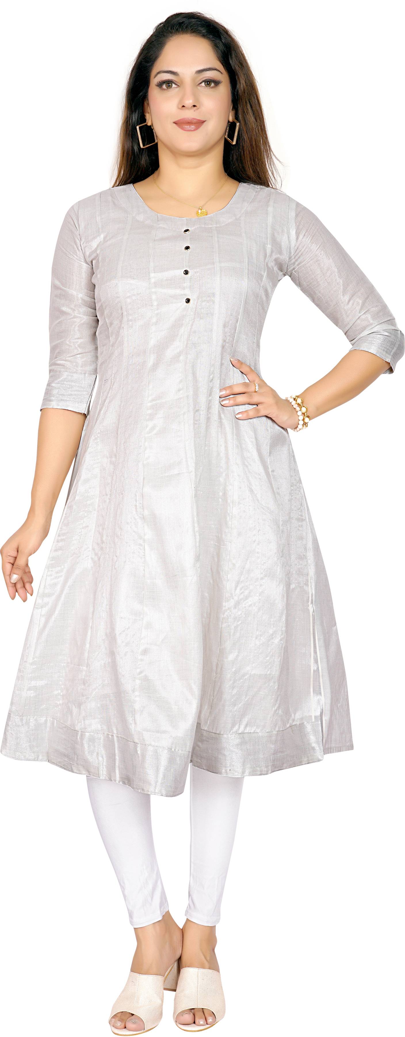 Women Solid Cotton Silk Flared Kurta (Silver)