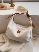 Overall, this canvas handbag with leather accents is a stylish and practical choice for anyone looking for a multifunctional piece that combines the ease of canvas with the sophistication of leather. Its unique design elements, like the cotton-attached handle and expansive zip closure, make it a standout accessory that is both functional and fashionable.
