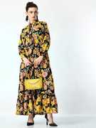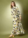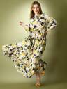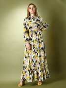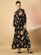 Multicolor Abstract Printed Balloon Sleeves Frilled Maxi Dress features a vibrant multicolor abstract print and dramatic balloon sleeves. Frilled detailing adds a playful touch, while the flowing maxi length ensures elegance and comfort for any occasion.