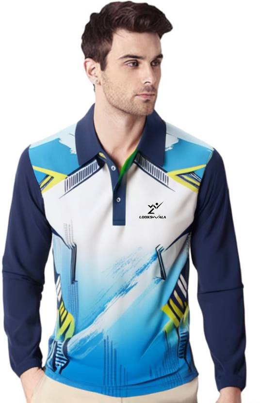 lookswala Printed Men Polo Neck Blue T-Shirt
