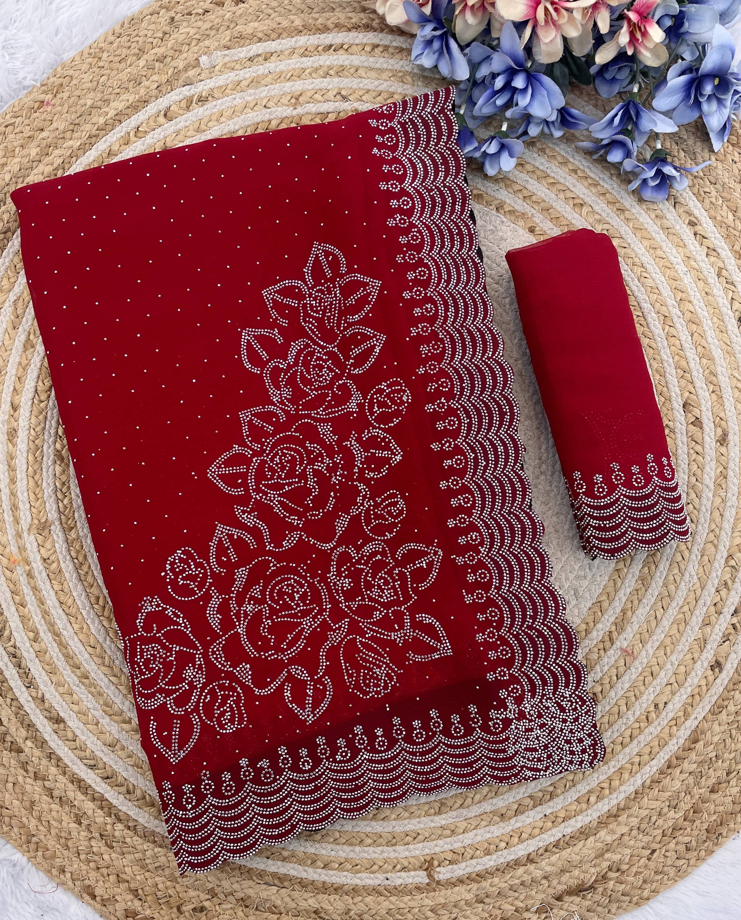 Elegance meets sophistication in this exquisite premium wine-colored georgette silk saree, a timeless masterpiece crafted for women who appreciate luxury and style. Delicately woven from the finest georgette silk fabric, this saree drapes effortlessly, enhancing your natural grace with every movement. The rich wine hue exudes opulence, making it perfect for any special occasion, be it a glamorous party, a cherished wedding celebration, or a joyful festival gathering. Its enchanting color palette adds a touch of allure and mystique to your ensemble, ensuring you stand out with unmatched poise and allure. Adorned with intricate detailing and subtle embellishments, this saree exudes an aura of sophistication and allure. The mesmerizing design, coupled with the luxurious feel of the silk, makes it a coveted addition to any discerning woman's wardrobe. Paired with an unstitched blouse piece, this saree offers endless possibilities for customization, allowing you to create a personalized look that reflects your individual style and personality. Whether you prefer a traditional blouse design or a contemporary twist, the versatility of this ensemble ensures you radiate confidence and grace with every wear.