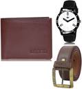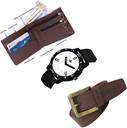 WATCH::-This Analog Watches comes with a Designer Look dial and stainless steel back. The dial is protected by a mineral glass and has a Designer strap for added comfort with Precious Finishing. The time is controlled by a single crown on the side of the watch. This watch is highly used for Sport plus Casual Wear. This watch is also highly recommended for new generation of india. This watches can be used for wedding, partywear, casual etc.WALLET::-2 ATM Cards Slot | Additional Zipper Currency Slot | 2 Secret (Hidden) Pockets |1 Coin Box | Brand Logo embossed | Light Weight | Smooth Finish | Trendy |Latest Design | Leather Wallet For Men The few things you carry, carry well! Great for gift. Enjoy your life and Just put a bow on it and you're ready to give to your special one. Our wallet not only offers security, it's also very functional. It features a quick access to IDs, driver license, ATM debit cards / credit cards, and has two long top slots for money, receipts, or tickets. The few things you carry, carry well!BELT::-Presenting the New LOREM Belt collection for Men, We create value for money with latest trends, New Large range Best Qulity Zinc material Designer Buckle, Light Weight, Long-Lasting with Stitch Synthetic Leather Material. This High quality product and Synthetic leather promises you durability and light weight. One size fits all For waist 30 inches to 44 inches.