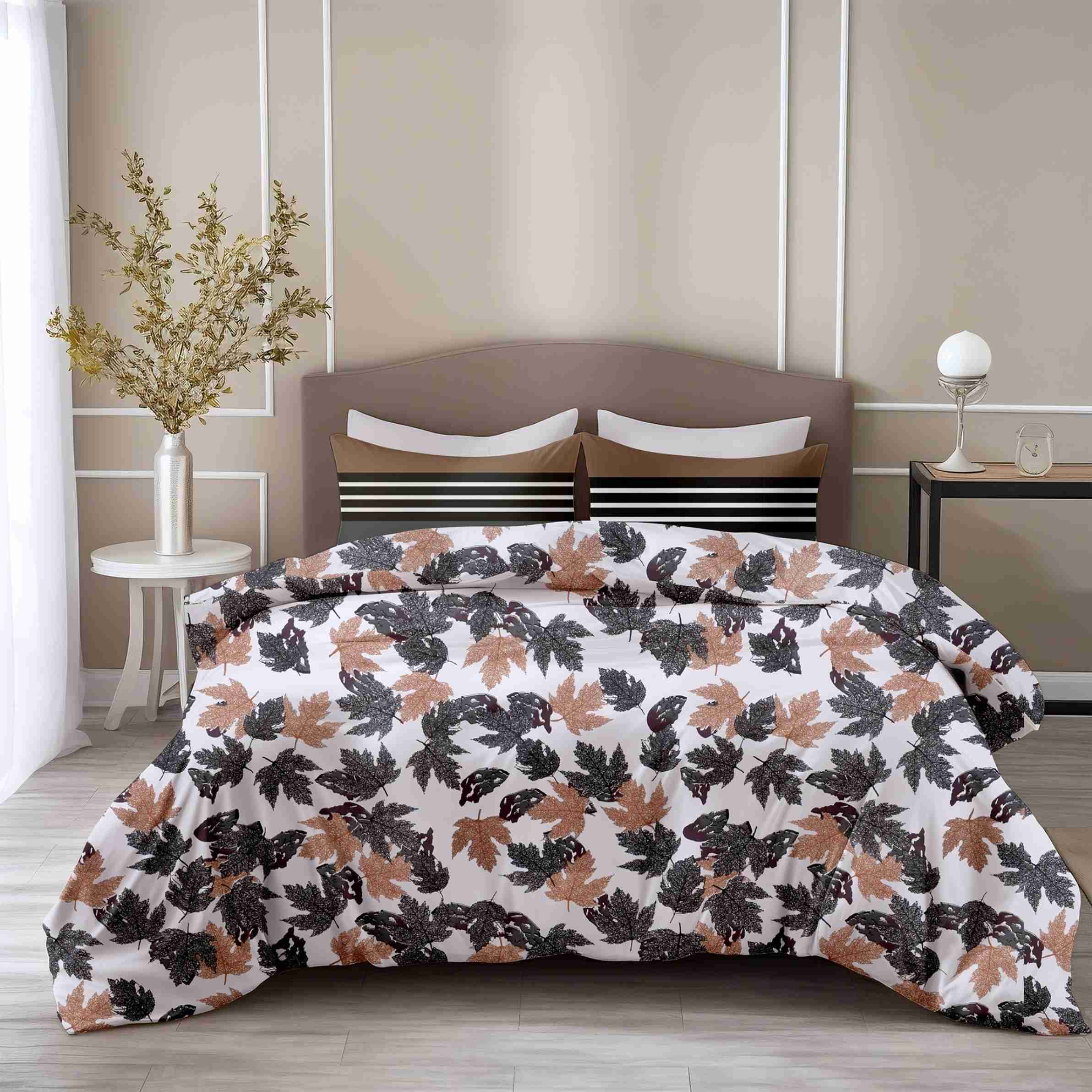 Cotton Double Flat 144 TC Printed Bedsheet (Pack of 1, Frosted Charcoal Leaf Pattern)