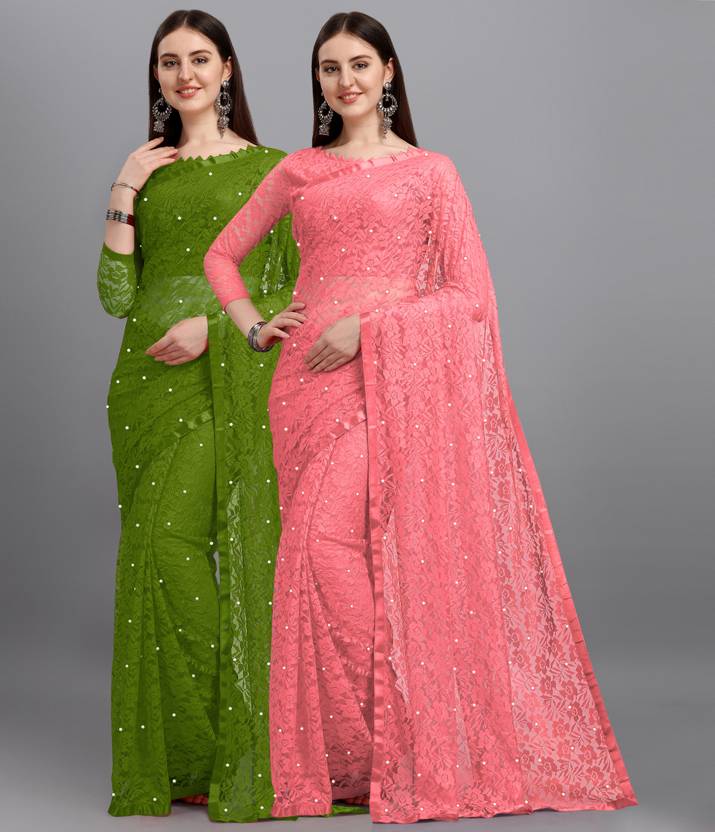 LOROFY Self Design Bollywood Net, Brasso Saree (Pack of 2, Multicolor)