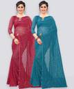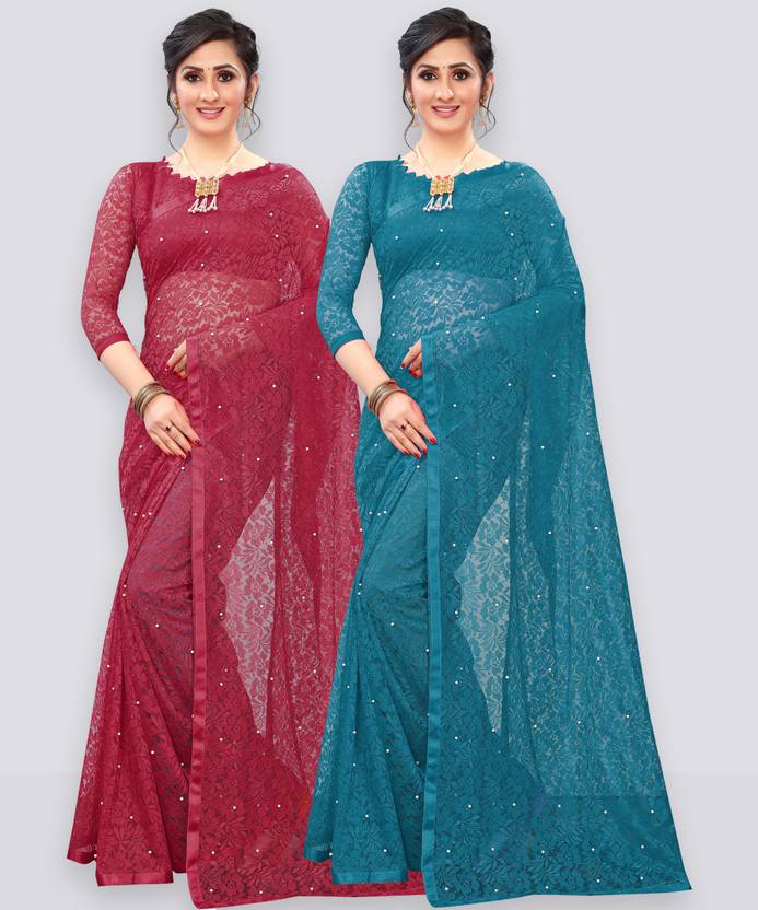 LOROFY Self Design Bollywood Net Saree (Pack of 2, Maroon, Blue)