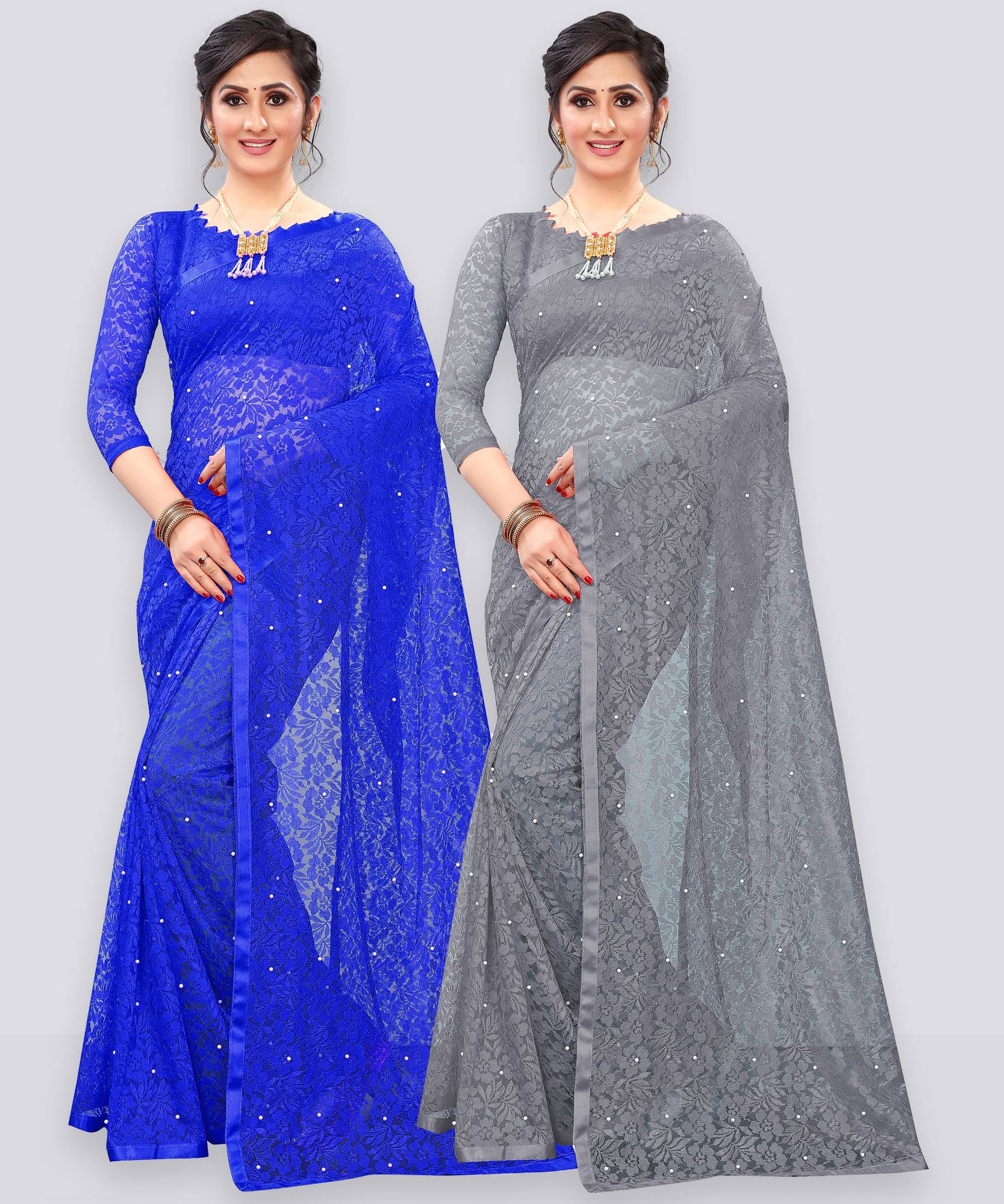 LOROFY Self Design Bollywood Net Saree (Pack of 2, Blue, Grey)