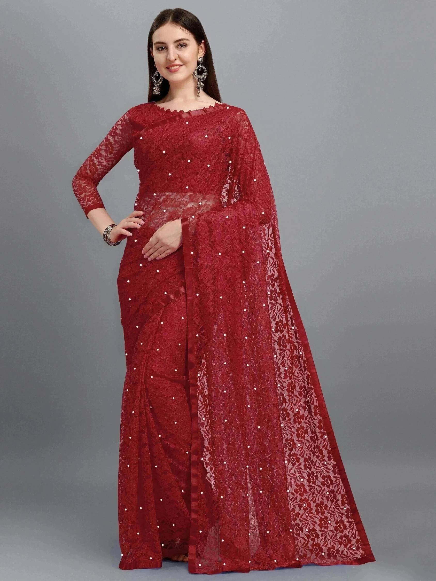 LOROFY Self Design Bollywood Net Saree (Maroon)