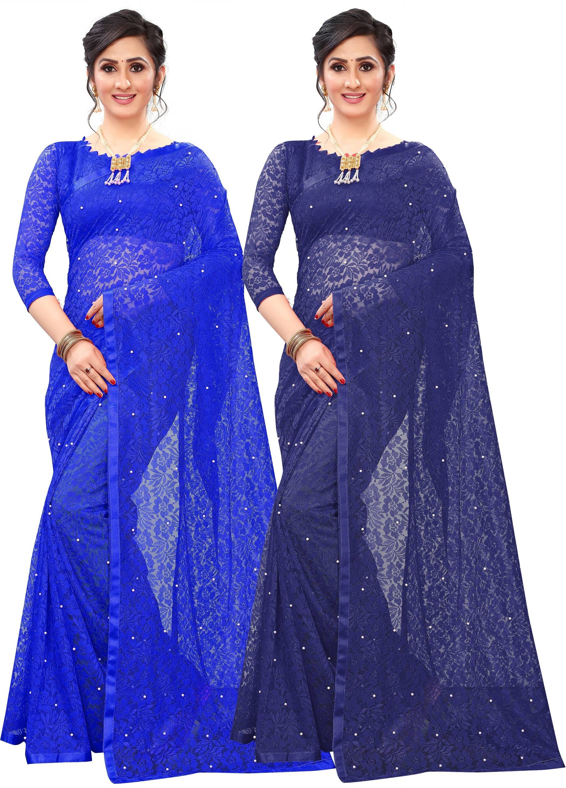 LOROFY Self Design Bollywood Net Saree (Pack of 2, Dark Blue, Blue)