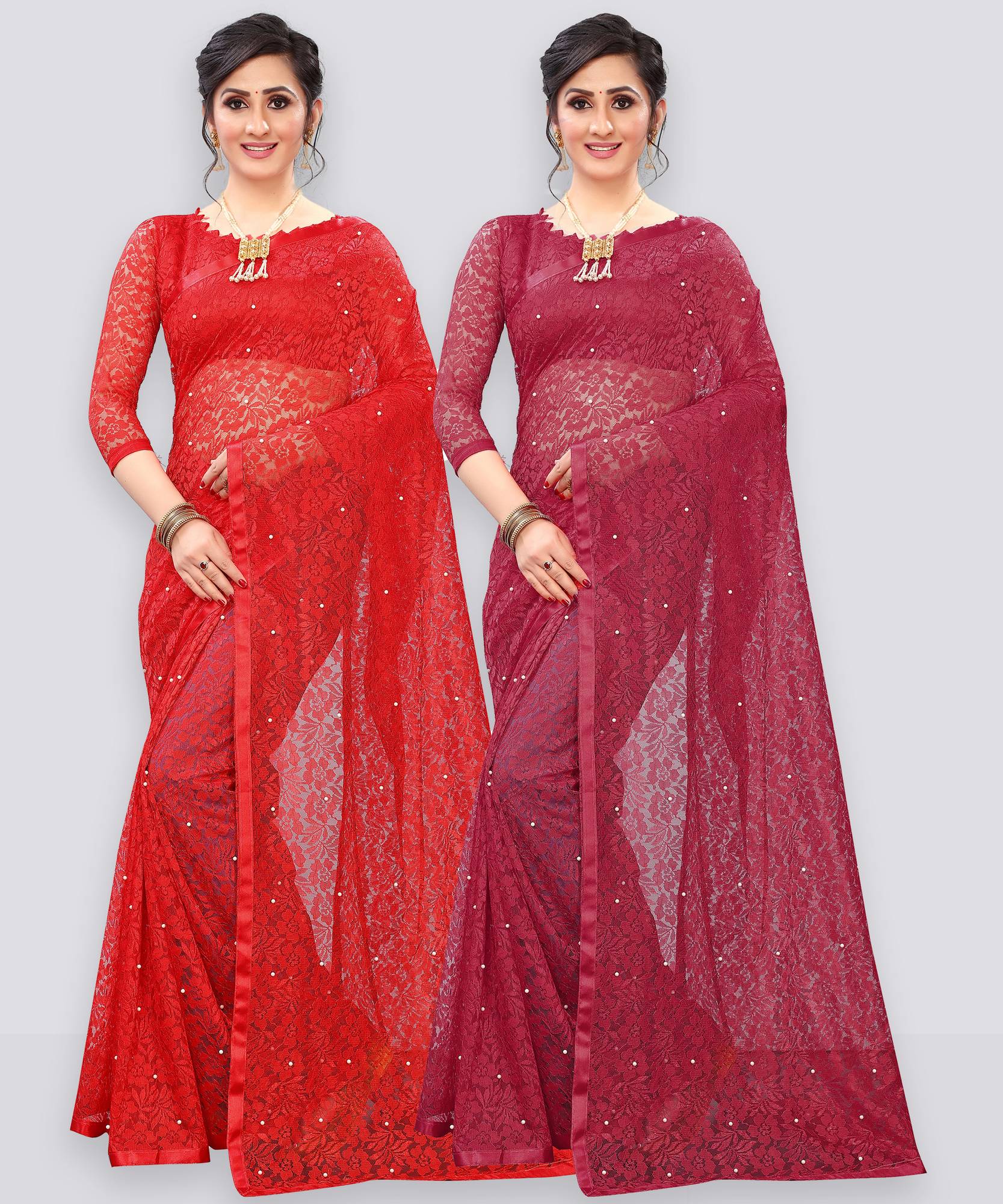 LOROFY Self Design Bollywood Net Saree (Pack of 2, Red, Maroon)