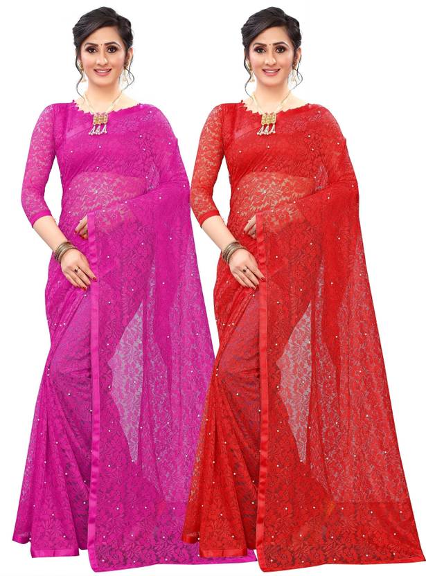 LOROFY Self Design Bollywood Net Saree  (Pack of 2, Red, Pink)