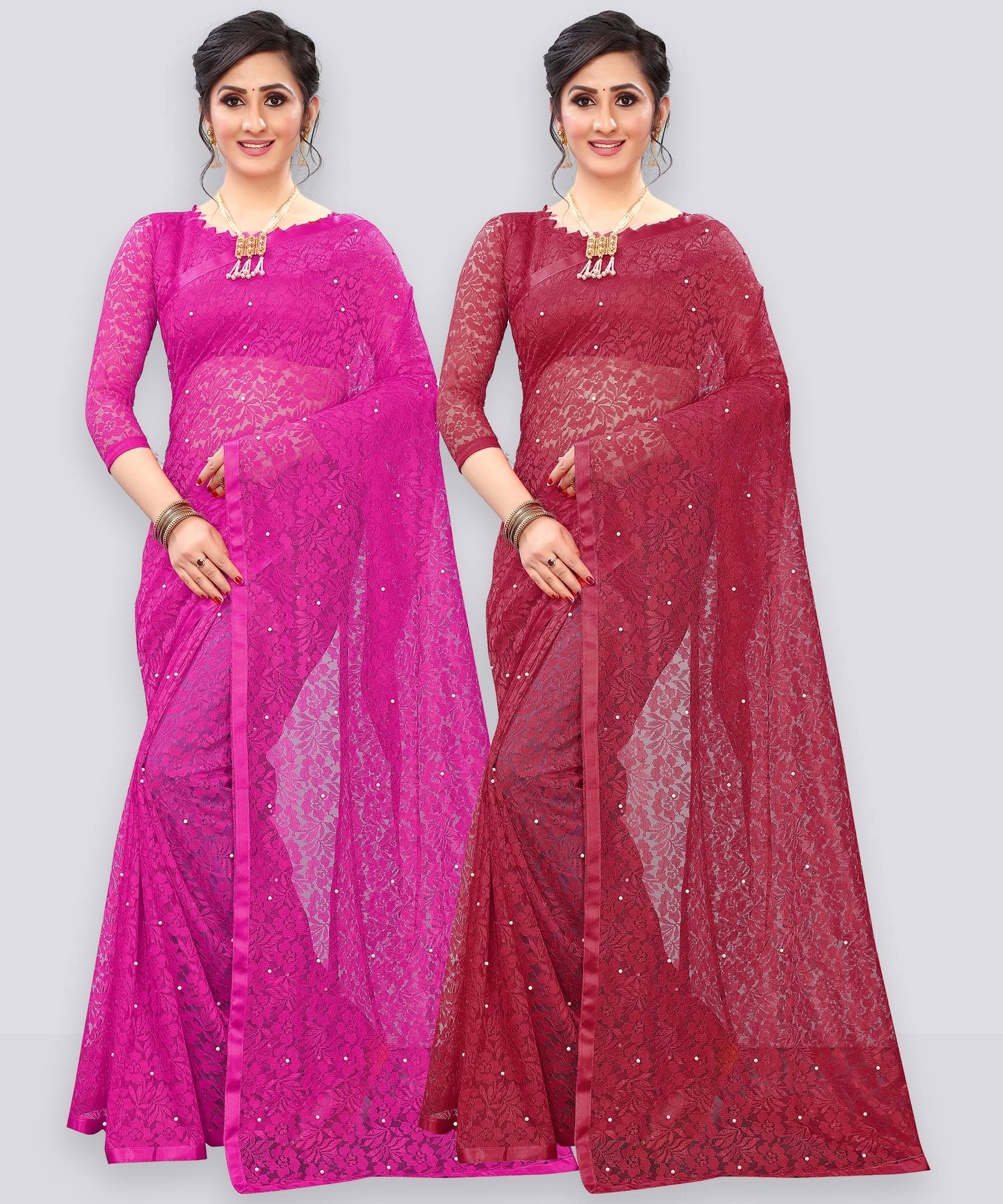 LOROFY Self Design Bollywood Net Saree (Pack of 2, Maroon, Pink)