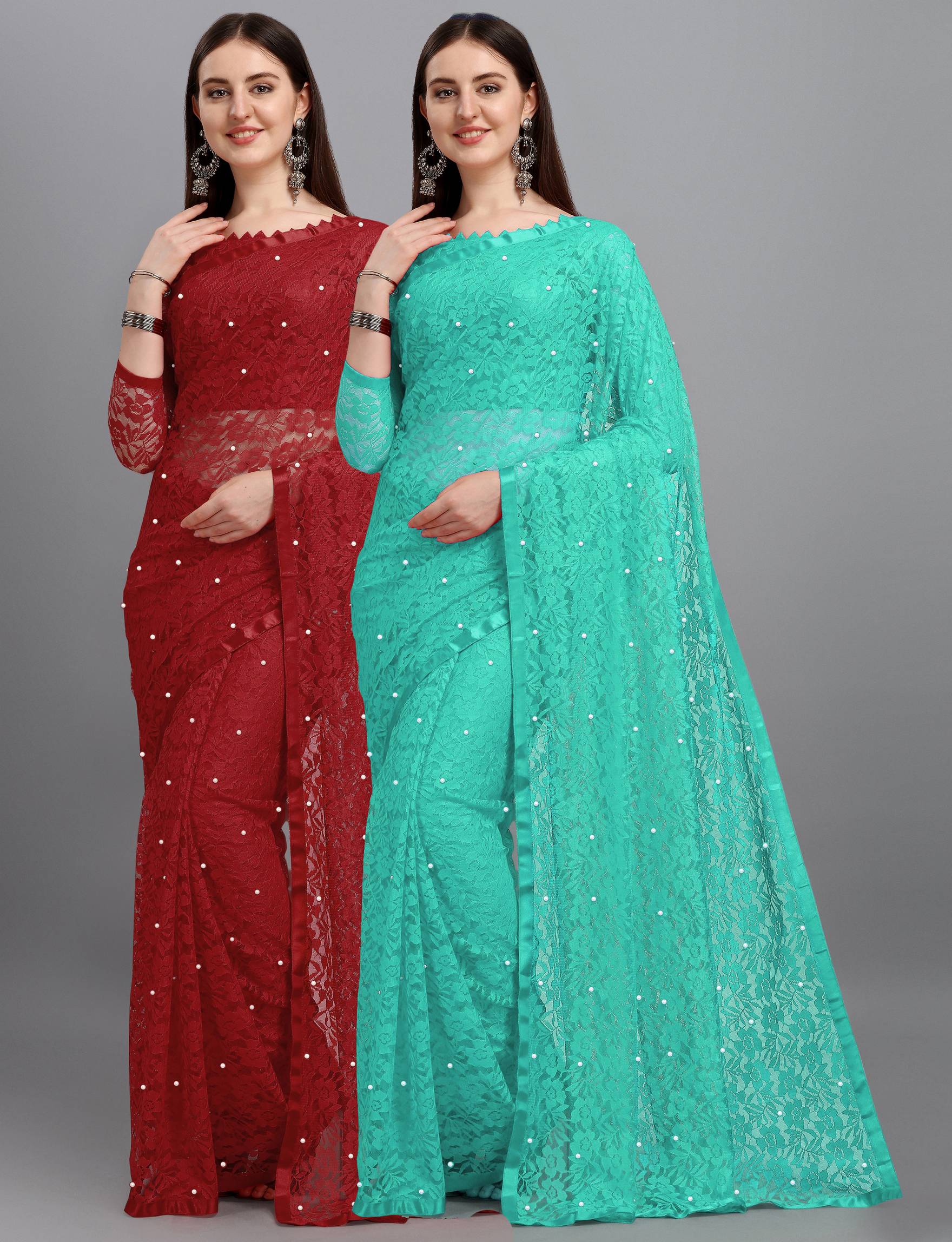 LOROFY Self Design Bollywood Net Saree (Pack of 2, Maroon, Light Blue)
