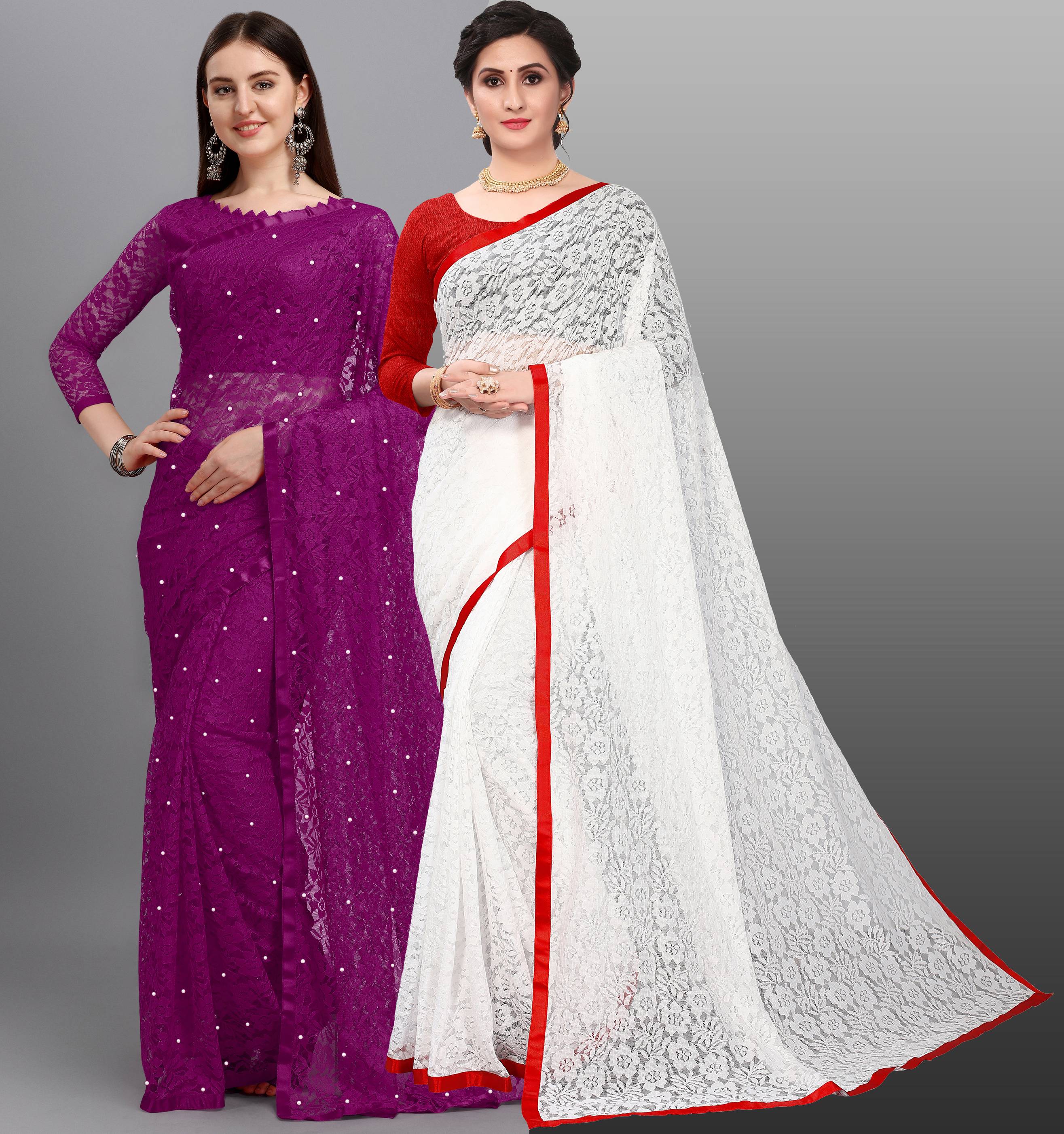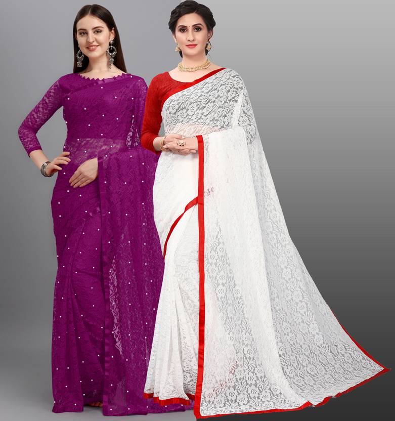 In Packet Contains Pack Of 2 Saree As Mentioned Colors With 2 Blouse Piace We bring Designer Jacquard Net Saree For Our Lovely Customers This Saree Made By High Export Quality Of Materials Saree Cloth Made By Soft Quality Cotton Materials Bringing Designer Machine Work Like Different Type Of Flowers On Saree With White Color Of Stone Work Saree 5.5 Meter With Complete Less Border Blouse 0.8 Meter Customers Can Stitched As Own Test With Pattern Give you perfect festival look in all the season and party