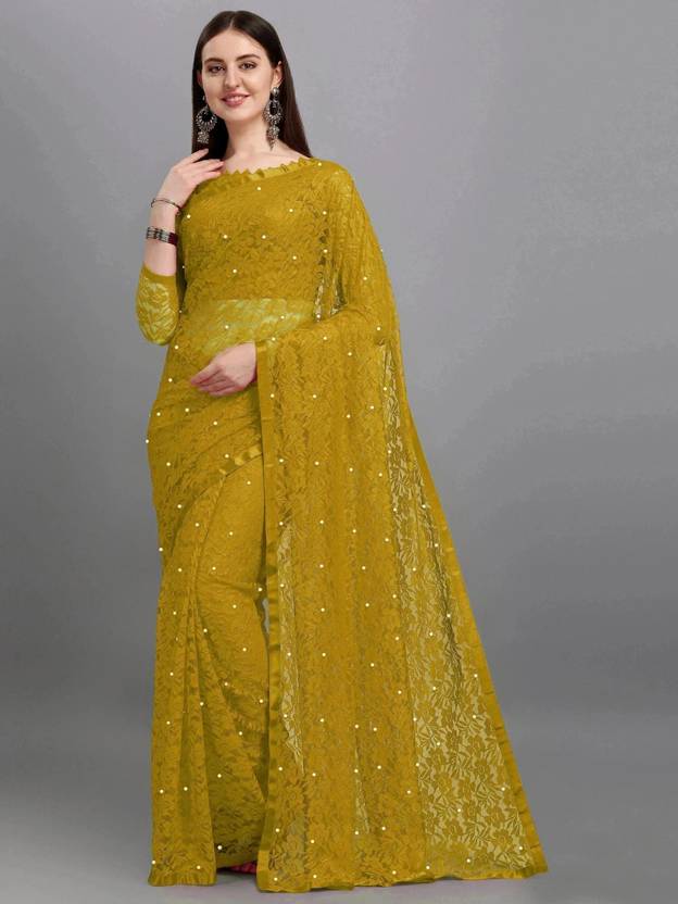 LOROFY Self Design Bollywood Net Saree  (Yellow)