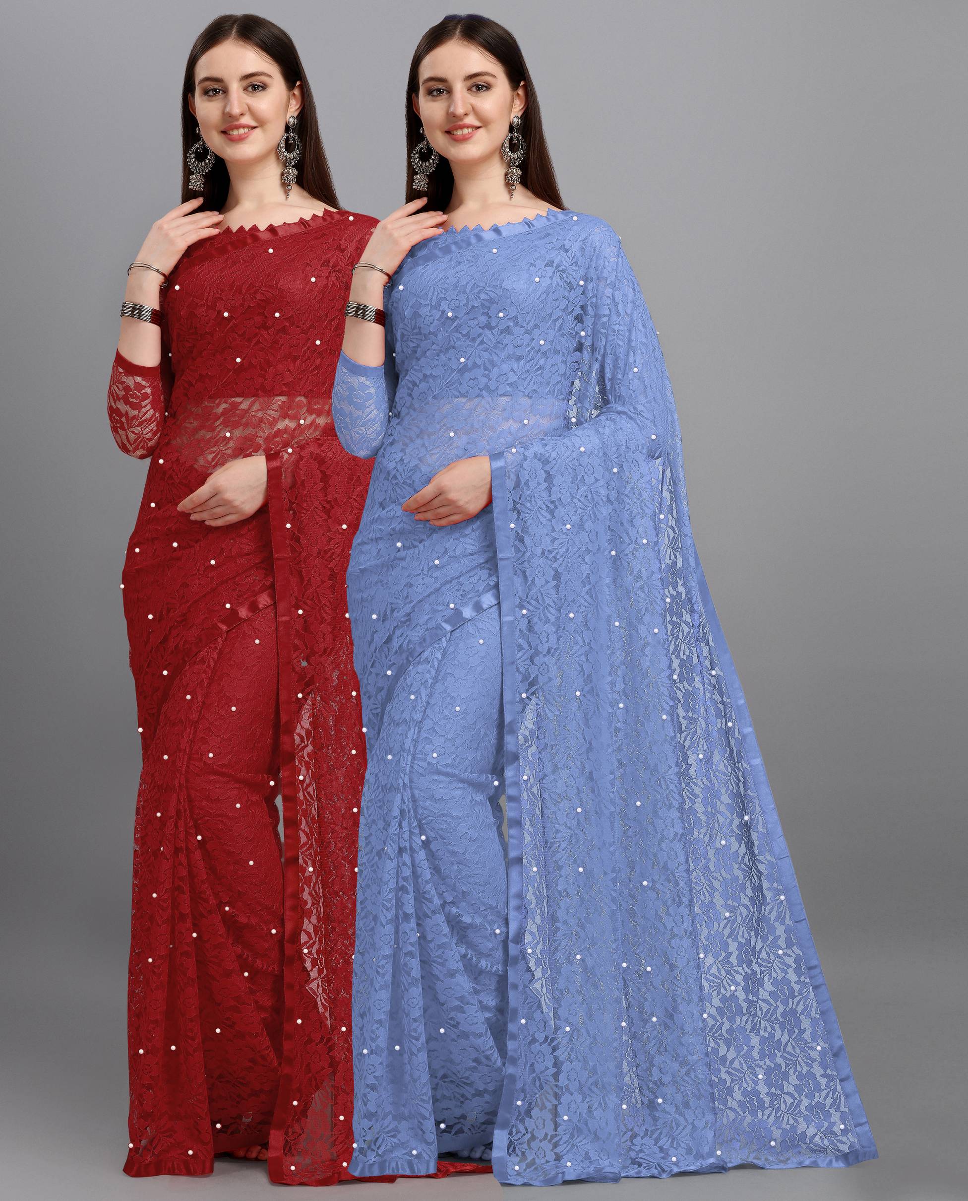 LOROFY Self Design Bollywood Net Saree  (Pack of 2, Multicolor)