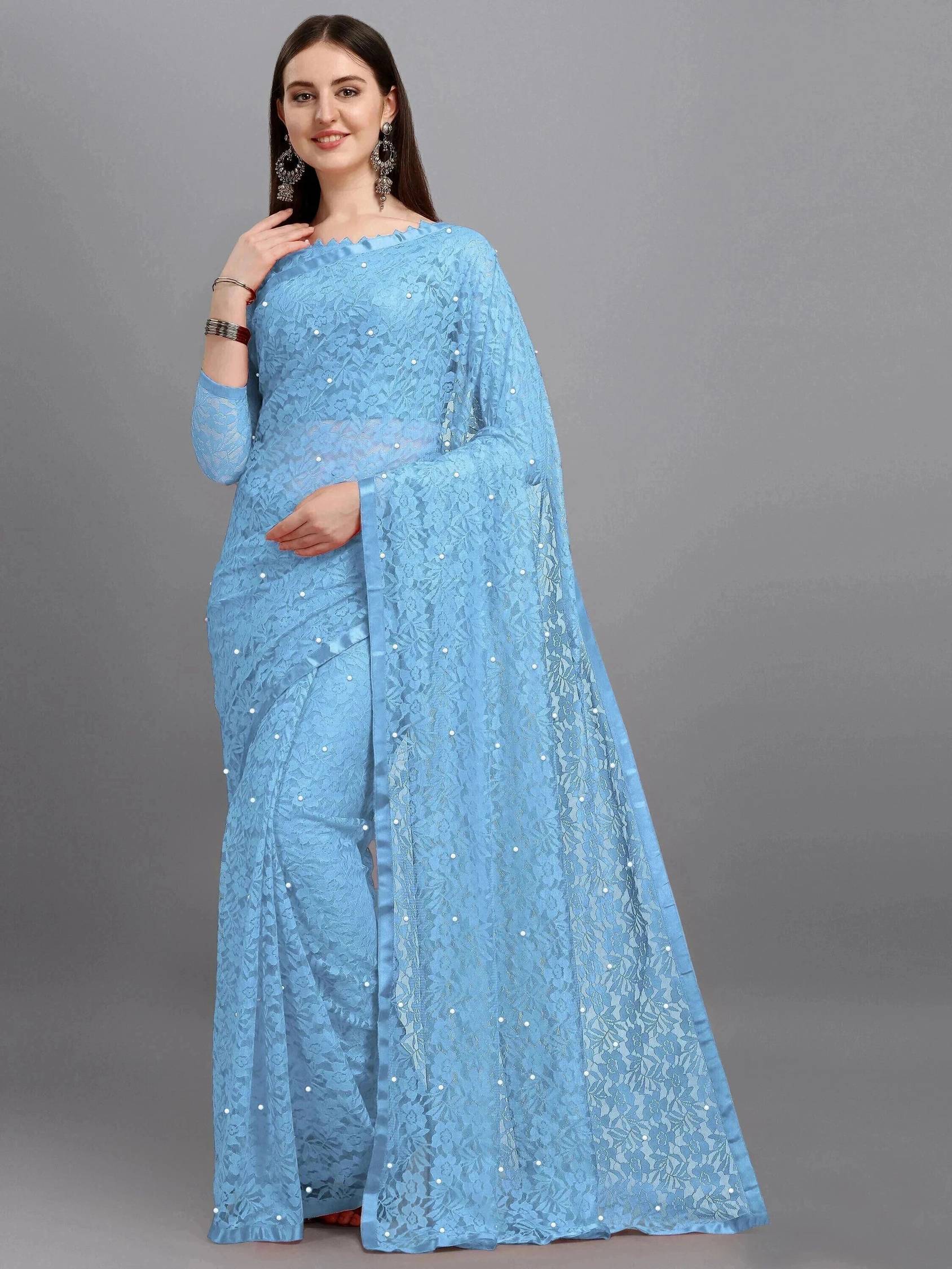 This saree is made of Brasso net, which is a jacquard weave polyamide fabric. Its semi-opaque feature brings out the best style in you. This saree is decorated with white beads, which can look stunning in any colour. The beads are tailored in the saree using a machine, so you don't need to worry about the beads falling off. Look your absolute best by pairing this saree with your favourite accessories and feel selfie-ready in no time.