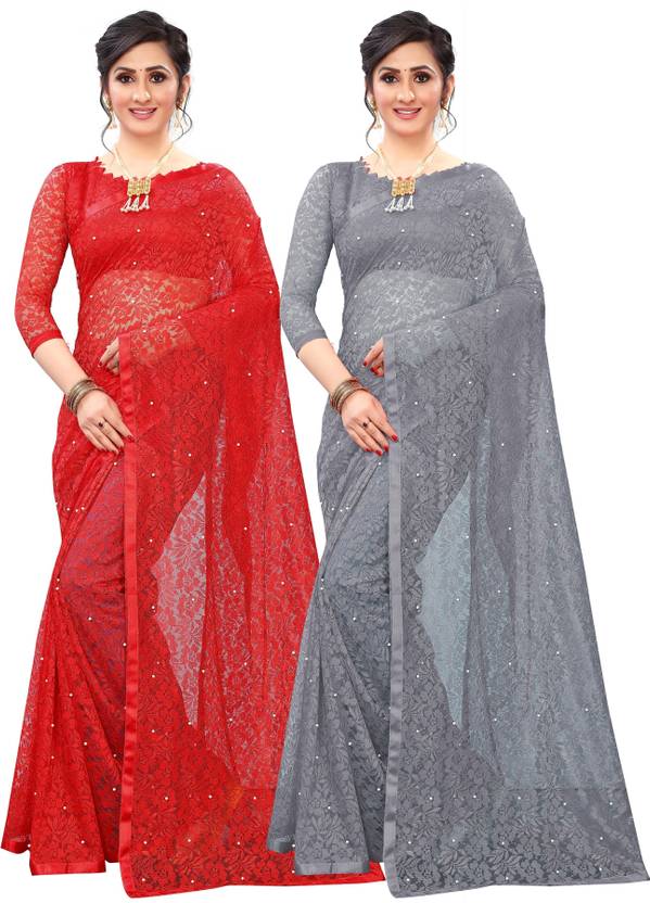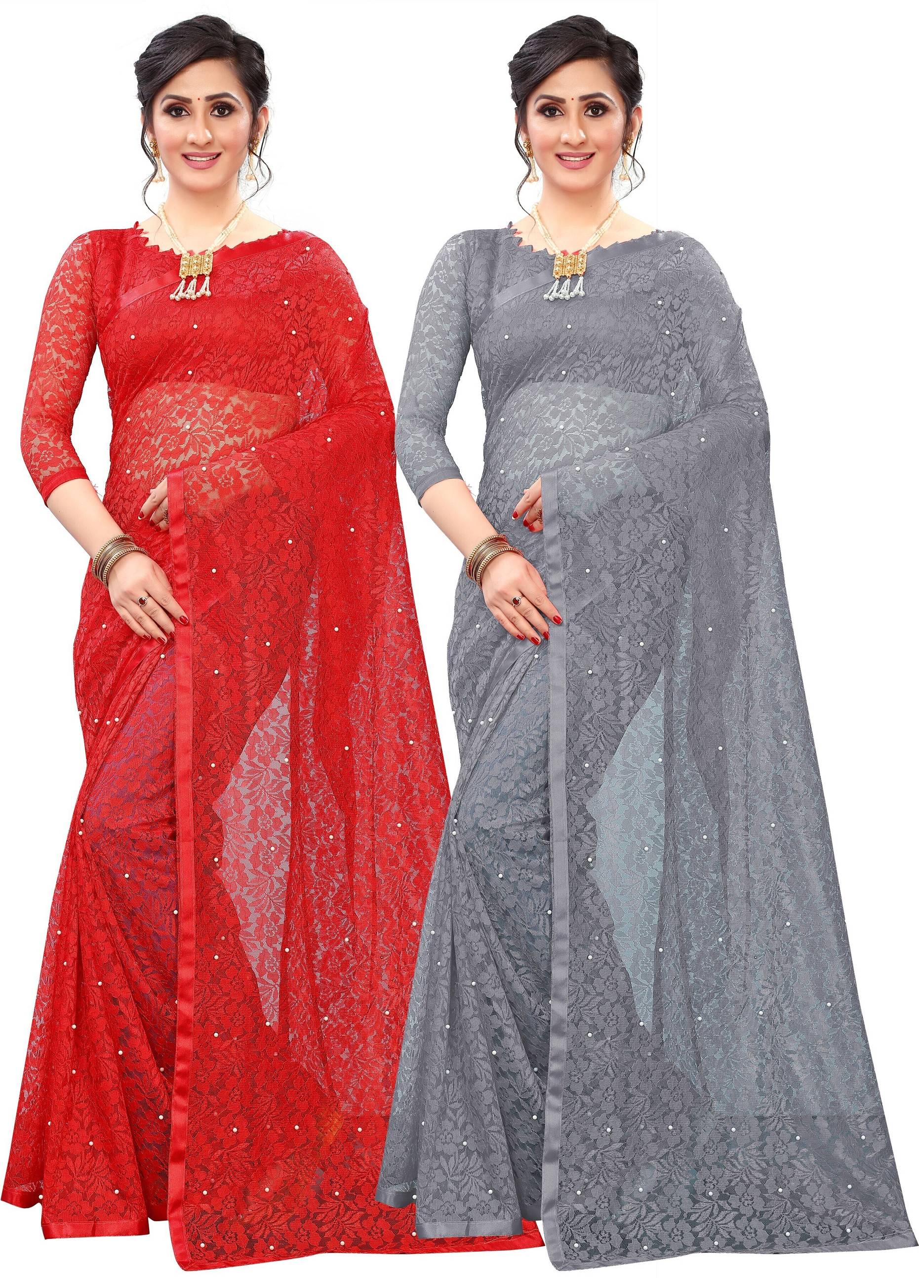 LOROFY Self Design Bollywood Net Saree  (Pack of 2, Red, Grey)
