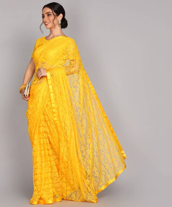 LOROFY Self Design Bollywood Net Saree (Yellow)