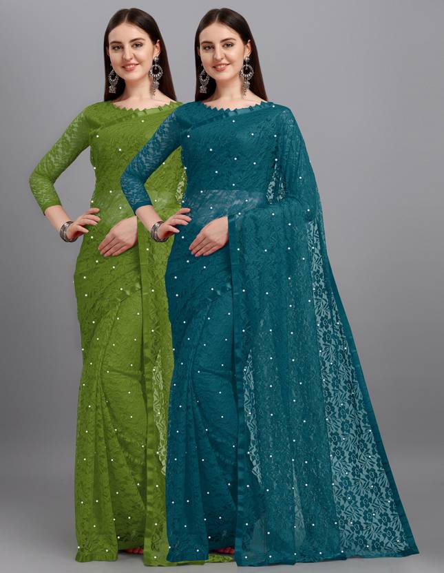 LOROFY Self Design Bollywood Net Saree (Pack of 2, Multicolor)