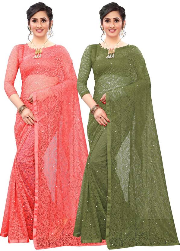 LOROFY Self Design Bollywood Net Saree (Pack of 2, Multicolor)